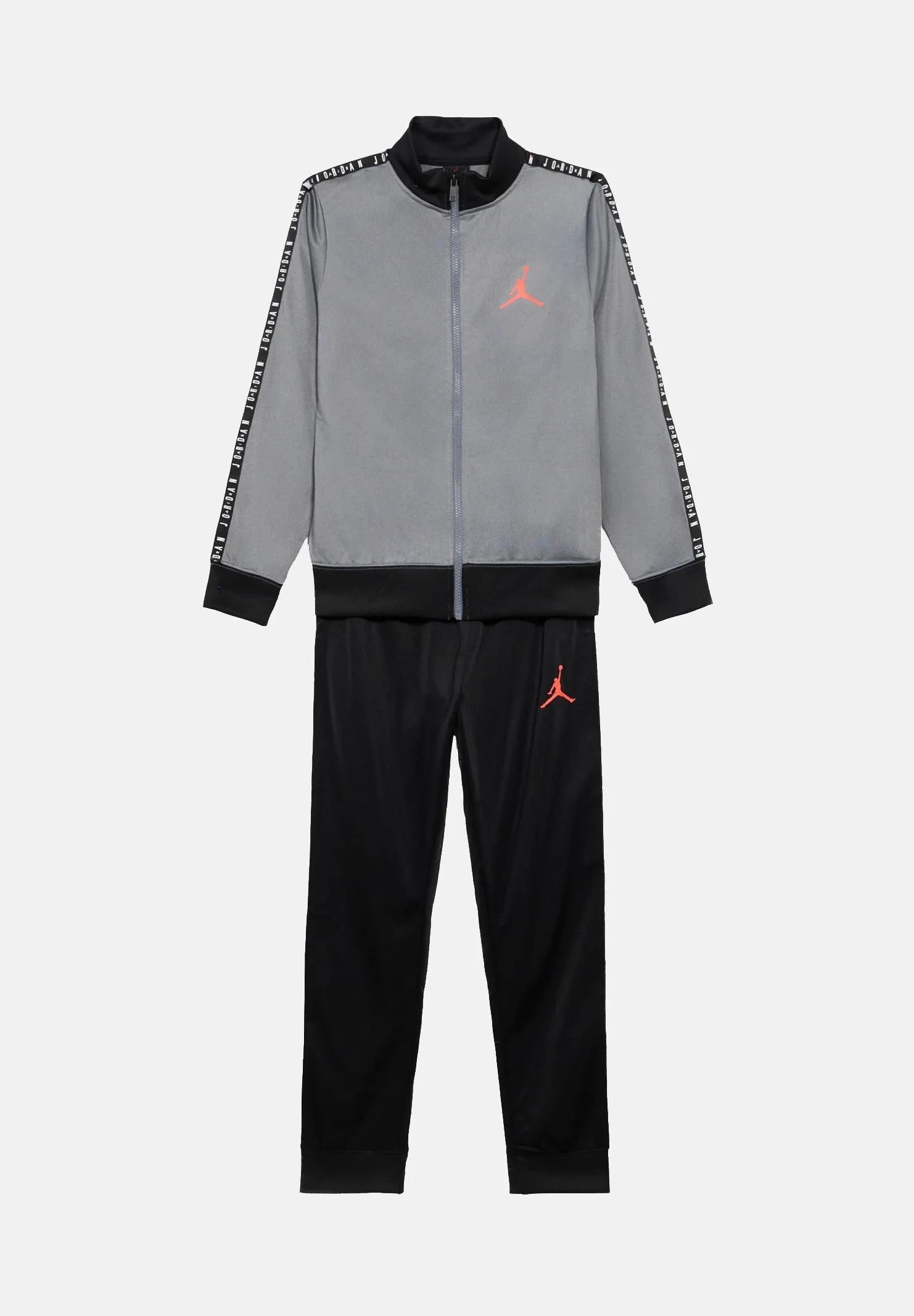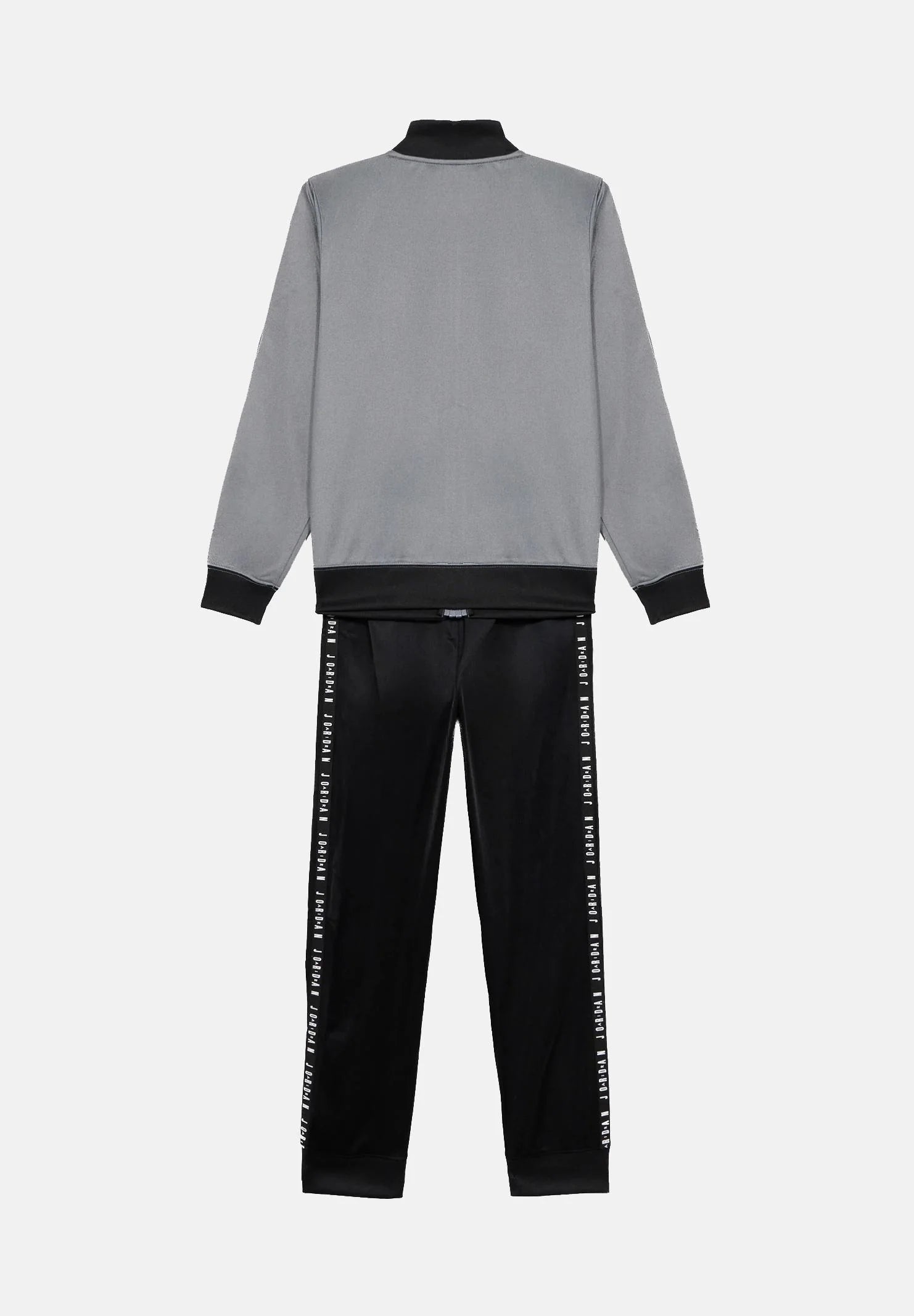 JORDAN Tuta grigia e nera da bambino composta da giacca con chiusura frontale con zip e pantaloni coordinati. La giacca presenta collo alto, profili a contrasto e polsini e fondo elasticizzati per una vestibilità confortevole, ed è rifinita con logo a contrasto sul petto e bande decorative lungo le maniche che aggiungono un tocco dinamico. I pantaloni, dal taglio regolare, sono dotati di vita elasticizzata e fondo elasticizzato per garantire libertà di movimento e praticità. Realizzata in tessuto tecnico leggero e confortevole, è ideale per l'attività sportiva e il tempo libero, perfetta per un look casual e sportivo allo stesso tempo. Si consiglia un lavaggio ed una stiratura a media temperatura. Stagione primavera estate.