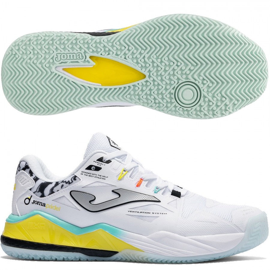 Scarpe da padel da uomo. Progettate per coloro che competono ai massimi livelli, questo modello premium offre prestazioni eccezionali e una stabilità superiore in ogni punto. Testate da giocatori professionisti su prestigiosi circuiti nazionali e internazionali. Tomaia realizzata in mesh tecnico. La tecnologia VTS ottimizza la traspirabilità e mantiene i piedi a temperatura costante. Il sistema di fissaggio termosaldato JOMA SPORTECH offre un supporto comodo, avvolgente e leggero, eliminando le zone di attrito. Inoltre, le parti sensibili sono rinforzate con la tecnologia PROTECTION. Intersuola in phylon, un materiale leggero e flessibile che offre un'ottima ammortizzazione e grande comfort in ogni movimento. Questo composto assorbe gli impatti durante spostamenti intensi. Dotato di doppio STABILIS, posizionati nell'area del mediopiede e dell'arco plantare. La loro funzione è massimizzare la stabilità dei movimenti e prevenire possibili lesioni. Il giocatore potrà muoversi con fiducia, mantenendo l'equilibrio, senza sacrificare l'agilità e la flessibilità necessarie nel padel. Suola Omni in gomma DURABILITY, composta da piccoli tacchetti circolari per migliorare la durata su superfici dure. Facilita lo scivolamento per raggiungere più velocemente la palla.